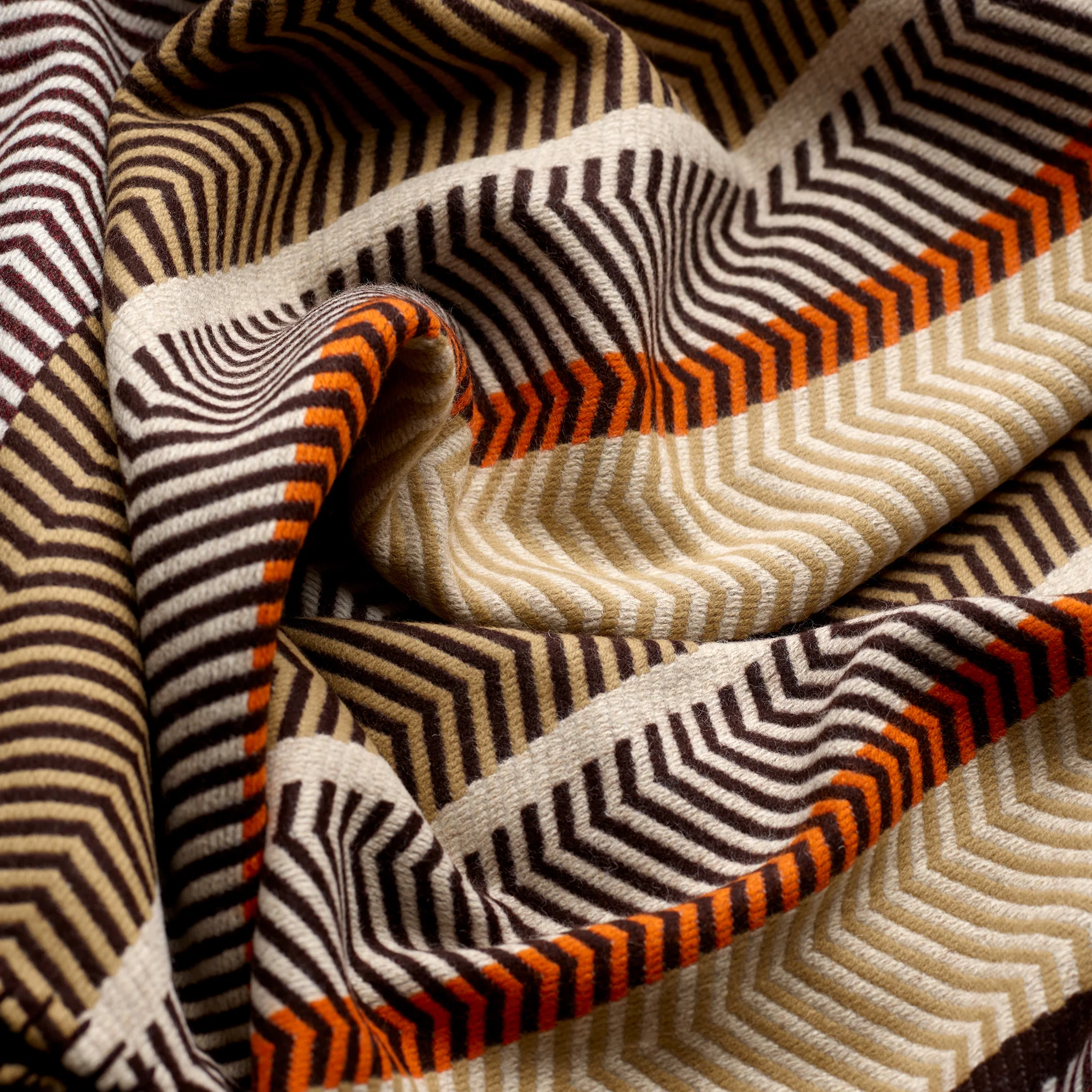A palette directed by Division Road combines vintage white, chestnut, tan and ebony, with a restrained copper accent running through the design. The result is a composed yet expressive pattern, drawing on English heritage and landscape without overt decoration. The design reflects Division Road’s considered approach to colour and pattern, interpreted through a large-scale woven structure.